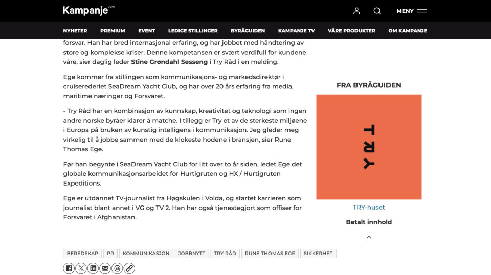 Byrået tagges opp i redaksjonelle artikler på Kampanje.com i saker der byrået blir omtalt.