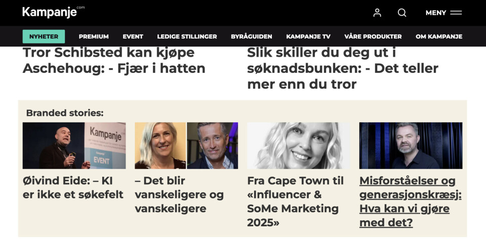 Branded Stories is our most effective branded content product. Branded Stories is a dedicated section on the front page of Kampanje.com where four articles are published simultaneously and remain visible for two weeks. These articles are first published as native articles in the main news flow and spread out over two weeks. During this period, we also include native ads linking to the article. The total exposure time for the articles is therefore one month.