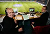 NRK-kommentator Arne Scheie (t.v.) hadde lenge med seg Karl Petter Løken i kommentatorboksen til NRK. I dag er Scheie pensjonist og Løken blir ny toppsjef i Kværner. Foto: Scanpix.