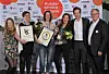 Jubler for pris: Fra venstre: Berit Kvaløy, (direktør i Kantar), Irene Fauskanger, Carina F. Bardhaj, Tonje Nordvik Lillestøl, Jon Almaas (prisutdeler) og Haakon Smeby (direktør i Loxysoft). Foto: Terje Borud.