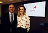 Matcher ny logo: Kreativ sjef Henrik Habberstad og markedsdirektør Karen Onsager Keiserud i Statoil, som for anledningen har tatt på seg en skjorte som matcher Statoils nye signaturfarge «rosekinn». Foto: Eivor Eriksen.