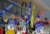 Pallen: Elvira Øberg, Marte Olsbu Røiseland og Tiril Eckhoff jubler for medalje etter søndagens jaktstart. Foto: Scanpix.
