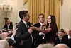 En medhjelper i presseavdelingen i Det hvis hus forsøker å ta fra CNN-reporter Jim Acosta mikrofonen, men han vrir seg unna og vil fortsette utspørringen av Trump.