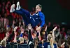 Hyllet: Norges landslagssjef Thorir Hergeirsson hylles av spillerne etter seieren i EM-finalen mellom Danmark og Norge i Wiener Stadthalle. Foto: Liselotte Sabroe/Ritzau Scanpix/NTB