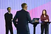Toppmøte: Espen Skoland (til venstre) og Kristin Skogen Lund ble intervjuet av TV 2-anker Kjetil H. Dale på Nordiske Mediedager torsdag. Foto: Thor Brødreskift