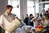 Glassene fylles med fruktmost, og tallerkener med den første av to retter settes foran gjestene. På tyve minutter skal de bli presentert for to smaksopplevelser.