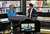 Topptungt i Arendal: Konsernsjef i Telenor, Benedicte Schilbred Fasmer, tok turen til Kongsberg Agenda sist helg. Da ble det også tid til en tur innom programleder Marius Lorentzen og Finansavisens TVs sending. Foto: Thomas Midteide.