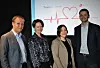 Betaler for nyhetspodkast: Espen Grimmert og Åsne Ådland-Dale fra Sparebanken Vest sammen med Ingvild Nave og Øyulf Hjertenes fra Bergens Tidende under lanseringen av BT20. Foto: Helena Flotve.