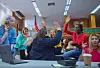 High Five: Det var nok high five også på kontoret til DNB da avtalen med Gwen Stefani var i boks. Her en gjeng kvinnelige investorer på aksjegulvet i DNBs nye reklamefilm.