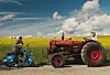 Hæææ: En ung mann prøver å komme seg til sentrum, men bonden er mest opptatt av at han skal høste raps. Foto: Mills